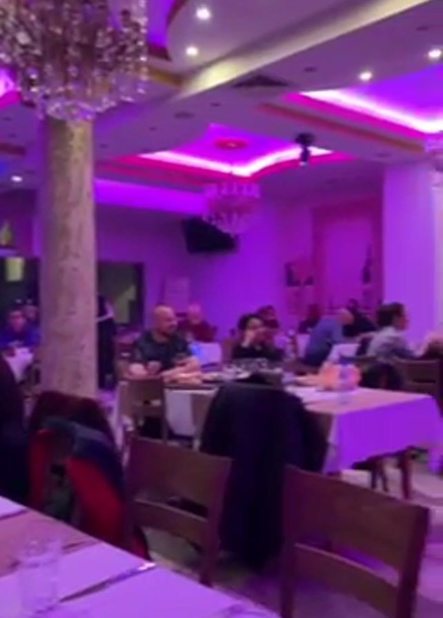 interior of a restaurant with a festive ambiance. The restaurant is illuminated with purple and blue lights, and the ceiling features ornate chandeliers. Several tables are set with white tablecloths, silverware, and glassware, occupied by people dining. The tables are predominantly wooden, with a few being marble-topped. Some people are engaged in conversations, while others are sitting quietly. The background reveals a mirror wall and a partially visible outdoor area. A person is walking through the restaurant. The atmosphere suggests a special event or a lively evening at the restaurant.