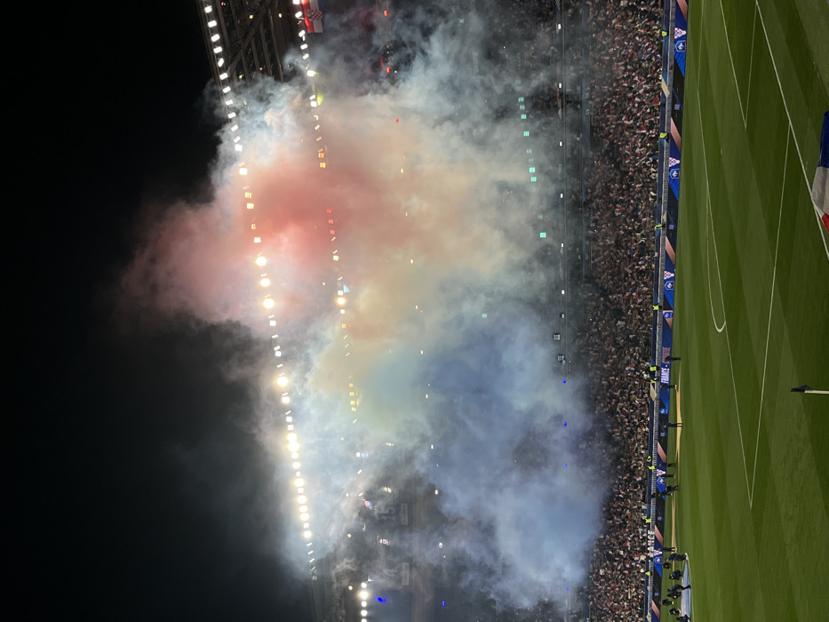 football stadium in Saint-Denis, France at coordinates 48.924 latitude and 2.36 longitude. The stadium is filled with spectators, all of whom are wearing white shirts and dark pants. A large amount of colored smoke is being released from the stands, obscuring the top part of the stadium. The smoke is red and blue, forming a cloud that obscures the top of the stadium. The pitch is green and well-lit, with the goal posts visible in the foreground. There are a few players on the pitch, but they are not visible in detail due to the smoke.