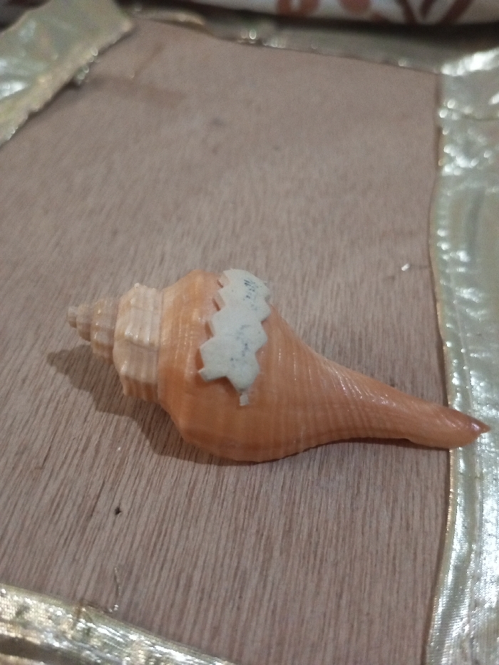 A light orange conch shell rests diagonally on a light brown wooden surface. The shell's spiral apex is oriented towards the upper left, while its pointed siphonal canal extends towards the lower right. An irregular white marking, possibly a chip or decorative element, is present on the dorsal surface of the shell's body whorl. The wooden surface features a visible grain pattern and is bordered on its left, top, and right edges by textured, reflective golden-colored strips. The scene is illuminated, casting a faint shadow beneath the shell. No individuals, animals, or active events are depicted. The location is Chandragiri, Nepal.