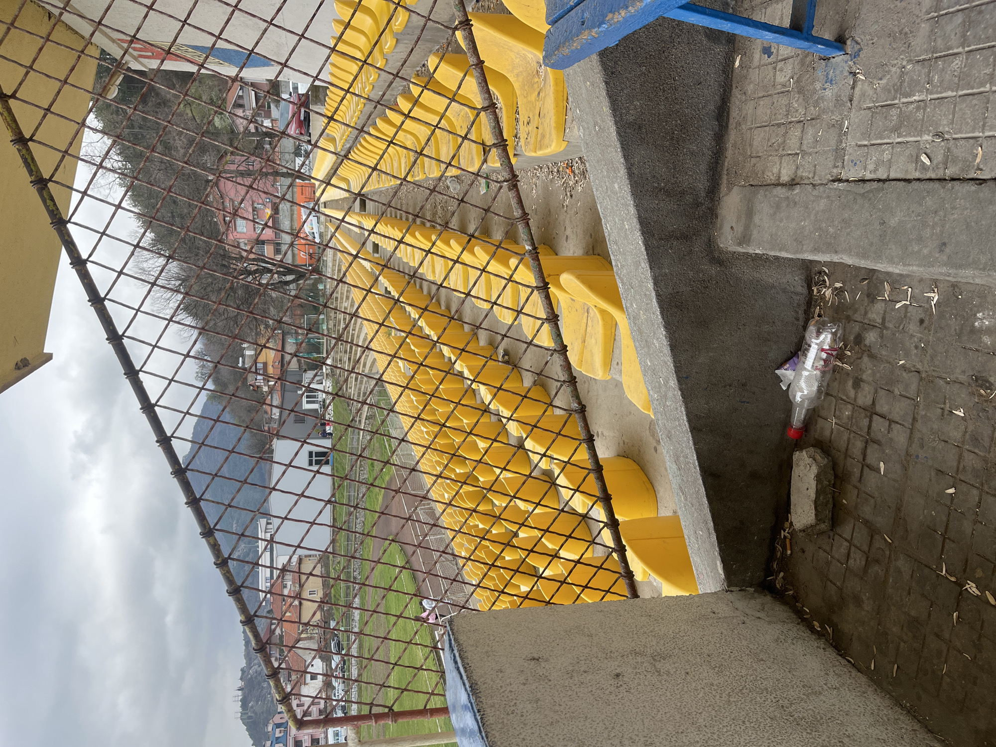 The image depicts a section of an outdoor stadium in Asenovgrad, Bulgaria, viewed from elevated spectator stands on an overcast day. A rusty, diamond-patterned wire mesh fence diagonally bisects the frame, serving as a barrier between the viewer and the field. Below the fence, rows of empty, individual yellow plastic seats are bolted onto concrete tiers, showing signs of wear and dirt accumulation. In the immediate foreground, a concrete base or wall runs horizontally. On the tiled ground surface adjacent to this wall, a clear plastic bottle with a red cap lies on its side, partially crushed. Next to it is a rectangular concrete block and a cigarette butt. Scattered dry leaves or seed hulls are visible on the ground. A partial blue wooden support structure is visible on the far right. Beyond the yellow seats, a green grassy sports field with a reddish-brown running track is visible. Two individuals in light and dark clothing are discernable on the track in the distance. The background reveals a residential area with various multi-story buildings, including structures with pink, white, and blue facades, and parked vehicles. Further in the distance, a large, tree-covered mountain dominates the horizon under a cloudy sky. On a distant hill to the left, several utility poles or communication towers are visible. A faded mural or logo featuring red, blue, and white elements is visible on a wall to the right of the seating area.