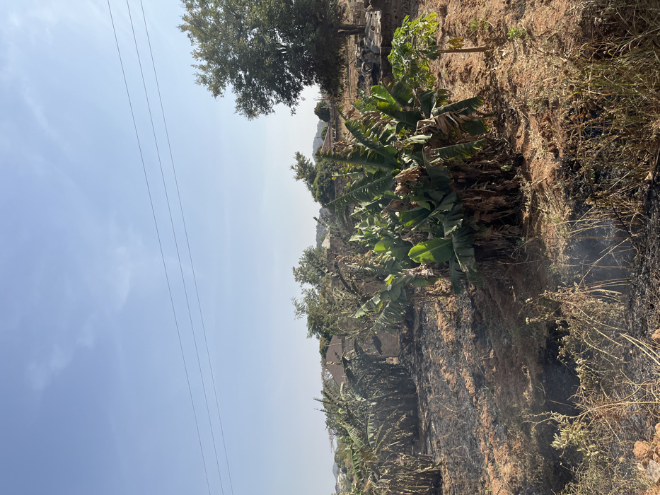 The image depicts an open agricultural plot in Pankshin, Nigeria, under a clear, bright blue sky with faint high-altitude clouds and three overhead utility lines. The ground is characterized by reddish-brown soil extensively covered with black charring and ash from a recent fire, interspersed with dry, sparse vegetation. In the mid-ground, multiple clusters of banana plants display a mix of vibrant green and dry brown leaves. To the right of the central banana cluster, a smaller, green-leaved papaya tree stands. The background features additional vegetation, including a large deciduous tree with green foliage on the right, partially concealing distant buildings with visible roofs and a section of a stone wall. Beneath the large tree, various inert objects resembling discarded tires or construction materials are present on slightly elevated ground. No human presence is observed.