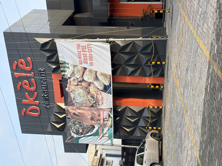 A multi-story restaurant building with a gray facade and geometric decorations displays signage promoting its food. Two large banners hang outside. The first displays pies and proclaims "We make the Best Pie in this City". The second shows other food items with prices of "N2,700", "1300", and "¥3,100". The restaurant's name, "Okela restaurant", is prominently displayed on the building's front. A silver car is parked beside the building in a parking area with yellow lines.