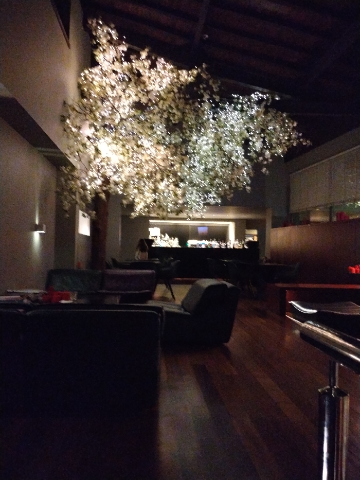 An indoor scene showcases a dim, modern bar or lounge area. A large, illuminated tree-like decoration dominates, drawing attention with its white lights. Dark, plush seating is arranged in the foreground, leading toward a bar in the background. The room features dark wood flooring and a neutral color palette on the walls. Lighting is subdued, creating an intimate ambiance.