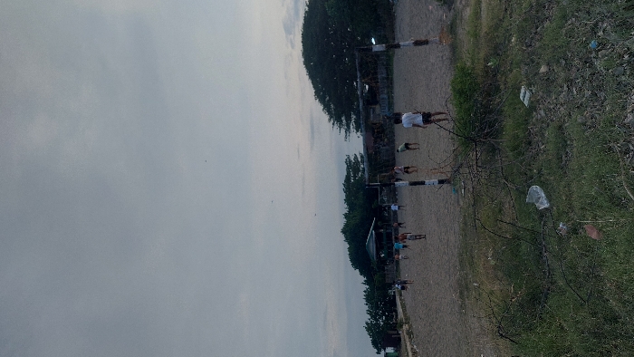 The image displays an outdoor scene in Unknown, Unknown, characterized by a large, light brown dirt and sand field under an overcast, light grey sky. In the foreground, sparse green grass, dry branches, and scattered refuse, including a white plastic bag, are visible. A rudimentary goalpost, constructed from two vertical posts painted with black and white stripes, stands on the right edge of the field, extending into the foreground. Approximately 12 to 15 individuals, mostly males dressed in casual shirts and shorts or shirtless, are distributed across the field, appearing to be engaged in a game of football (soccer). One individual in a white shirt and dark shorts stands near the foreground goalpost, facing away from the camera. In the background, another similar makeshift goalpost is visible on the left. The mid-background features a larger building with a dark roof and open sides, flanked by dense green trees and foliage. Additional smaller buildings with light-colored roofs are discernible on the far left. The overall lighting is dim and diffused, consistent with an overcast sky.