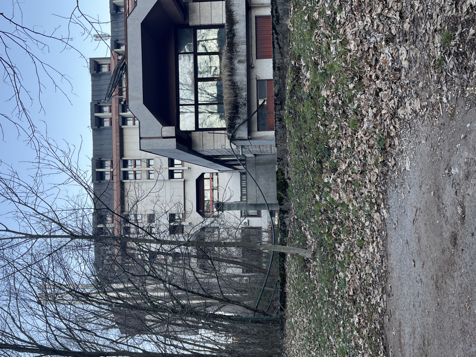 The image portrays an urban landscape in Cetinje, Montenegro, featuring a multi-story building complex under a clear, pale blue sky. The foreground consists of a dirt path leading to a grassy slope densely covered with dry, brown deciduous leaves. A single slender tree with bare branches stands on this slope, slightly left of center. In the mid-ground, a concrete structure with a large, dark-framed window reflecting the sky is visible on the right. Below this window, a ledge shows signs of dried vegetation, and further down, two red-brown garage doors or utility entrances are present. A thick black cable runs horizontally along the lower part of this structure. To the left and behind this structure, another section of the complex appears, characterized by light-colored concrete and numerous rectangular windows with dark frames and red-brown sills, partially obscured by bare trees. A concrete pillar or utility stack rises near the foreground tree, and a dark, possibly metal, barrier or fence section is visible behind it. The background features the upper sections of a large building, likely the main part of the complex. It exhibits a distinctive dark mansard-style roof punctuated by multiple small dormer windows. The upper facades are light-colored concrete with rectangular windows. Numerous bare deciduous trees with intricate branch patterns frame the building on the left side. No individuals or active interactions are visible in the scene.