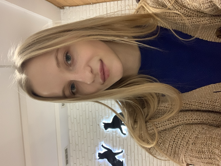 A blonde woman with fair skin looks at the camera, wearing a royal blue top and tan cardigan. Her hair is long and straight. She is indoors with a white brick wall visible in the background featuring two cat silhouettes. The image is slightly angled. The top of a wooden surface is also visible in the upper corner.