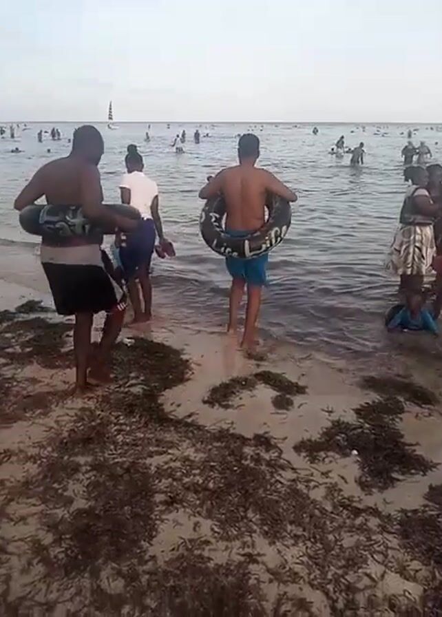 beach scene where several people are wading in the shallow water, with many more visible further out. Two men, shirtless, are walking into the water carrying inflatable swim rings with patterned designs. A woman in a white shirt and a girl in a skirt are seen on the left of the men, while a group, including a child, is gathered to the right. There appears to be seaweed scattered along the shoreline. In the distance, one can spot a sailboat, and the sky is overcast.