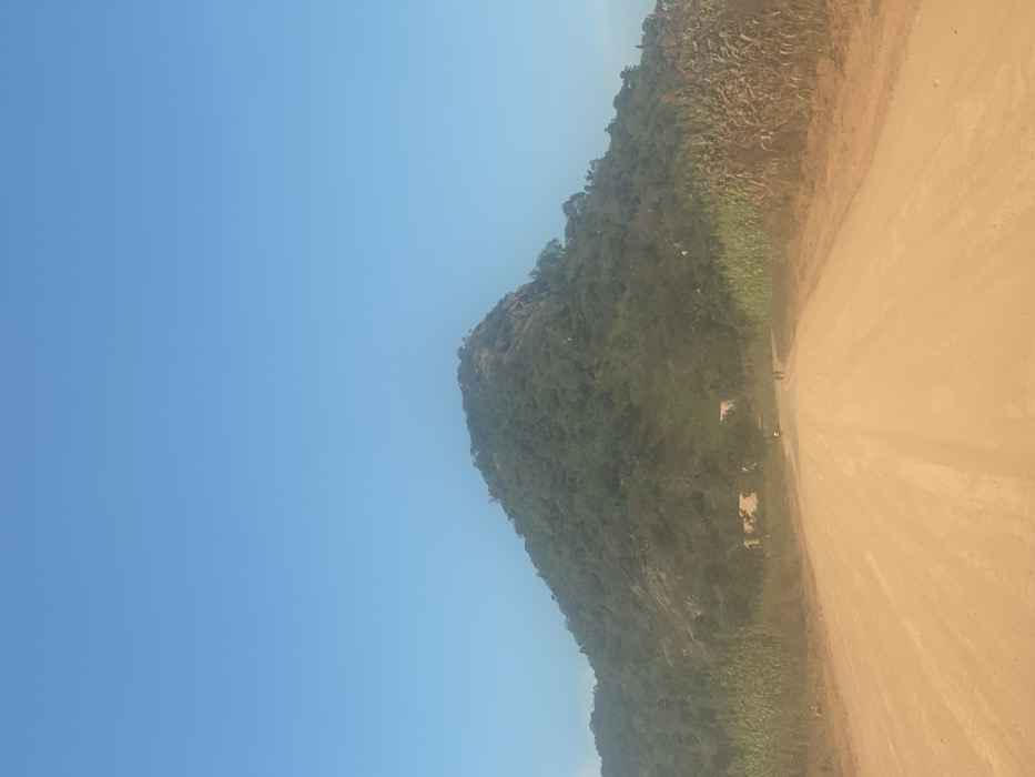 The image depicts a rural scene in Madakiya, Nigeria, viewed along a wide, unpaved, reddish-brown dirt road extending into the distance under a clear, bright blue sky. Dust is visibly suspended in the air at ground level, creating a slight haze. In the mid-ground, a prominent, steep hill or small mountain covered in dense green vegetation rises, with exposed rocky formations visible near its peak. Along the left side of the road, green, tall-stalked crops (consistent with maize) are visible, behind which a cluster of light-colored, single-story structures with reddish roofs are partially obscured by vegetation at the base of the mountain. On the right side of the road, drier, browner stalks of similar crops line the foreground and mid-ground. Two individuals are observed walking away from the camera along the dirt road, approximately midway between the foreground and the mountain base. Further in the distance, a third, smaller figure or group is discernible on the road near the base of the mountain.