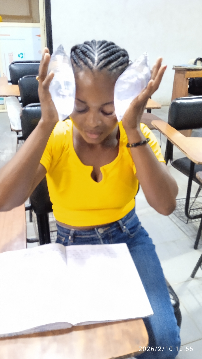 The image depicts an indoor scene in a classroom or training room located in Ikeja, Nigeria, timestamped February 10, 2026, at 10:55. A young Black female is centrally positioned, seated at a wooden desk. She wears a short-sleeved yellow top with a V-neck and blue denim jeans. Her hair is styled in cornrows. Both of her hands are raised, each holding a clear plastic bag containing a translucent substance, likely water, pressed against the sides of her head over her ears. Her eyes are directed downwards towards an open notebook with handwritten text resting on the desk in front of her. A golden ring is visible on her left ring finger, and a dark beaded bracelet adorns her right wrist. The background shows rows of empty wooden desks with black upholstered chairs. A white wall with a sign displaying text and a green recycling symbol is visible on the left. The floor appears light-colored.