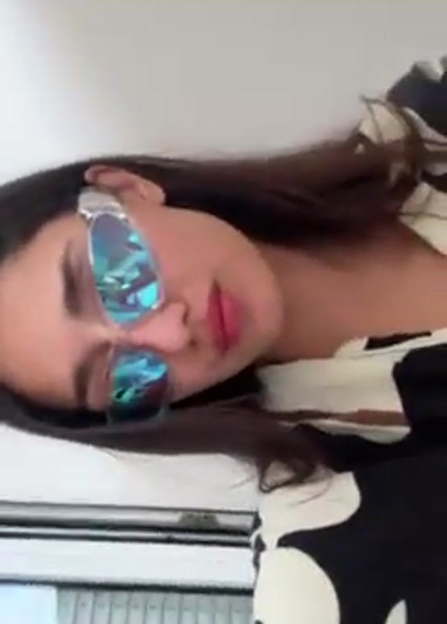 A woman with long dark hair is wearing blue mirrored sunglasses, a white shirt, and a black top