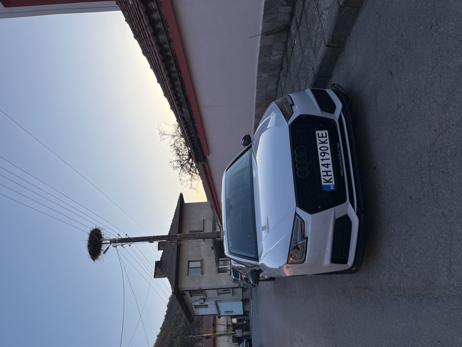 A white Audi Quattro sedan, bearing Bulgarian license plate BG KH 4190 KE, is parked on the right side of a paved street in Sapareva Banya, Bulgaria, facing towards the viewer