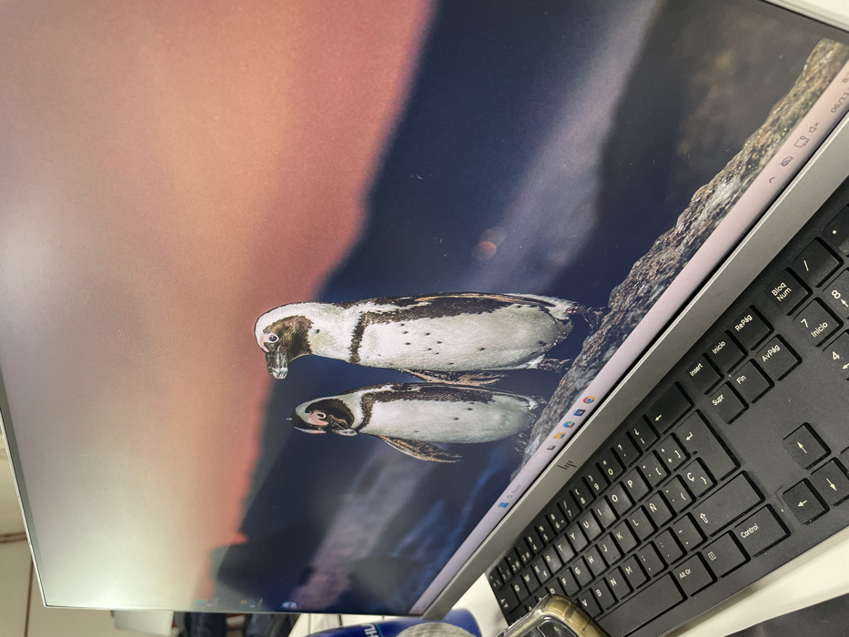 A computer screen displays an image of two penguins swimming in water against a backdrop of orange and dark blue. The screen is surrounded by a silver frame, and a black keyboard is visible to the right. Part of a phone in a clear case is at the bottom. The keyboard features rows of keys with Spanish labels such as "Inicio," "Supr," and "Control." The upper right corner of the screen shows a date: "06/11."