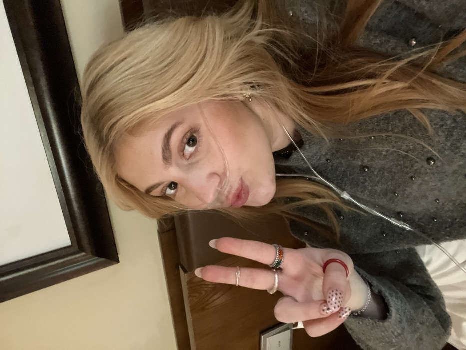 A young adult female is depicted in an indoor setting, likely a room with a dark wooden headboard or wall paneling visible behind her. She has long, wavy blonde hair and is looking directly at the camera with a puckered lip expression. A clear nasal cannula is positioned in her nostrils, with tubing extending over her ears and down her chest, indicating oxygen therapy. She wears a grey long-sleeved garment adorned with numerous small, dark, round studs. Her left hand is raised, forming a peace sign with her index and middle fingers extended. On her left hand, she wears a silver band on her index finger, a textured silver ring on her middle finger, a multi-colored band on her ring finger, and a red band on her pinky finger. Her fingernails are painted with a light base and dark, irregular spotted pattern. A silver chain bracelet is visible on her left wrist. Gold-colored earrings are visible in her ears. A dark-framed object is partially visible on the wall in the upper left background. White bedding or fabric is visible beneath her left arm. The location cannot be determined from the image.