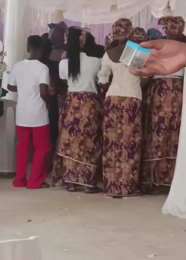 gathering of people in what appears to be a hall or event space decorated with white draping. Several women stand together, most wearing similar outfits: long, patterned skirts in shades of brown and purple, paired with white tops and matching headwraps. One person in the group stands out, wearing a white t-shirt and bright red pants. A hand holding a small, square metal container with a blue lid briefly appears in the foreground. The floor is light-colored and somewhat dirty, with small debris scattered around. The overall impression is that of a social gathering or celebration of some kind.