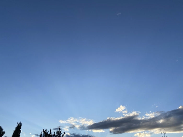 The scene, located in Tighennif, Algeria, depicts an outdoor environment dominated by a vast expanse of clear blue sky. The sky transitions in color from a lighter blue near the lower horizon to a deeper blue in the upper portion of the frame. Multiple cloud formations are present; a prominent, elongated band of dark grey and white-edged stratocumulus clouds occupies the lower right quadrant, accompanied by smaller, scattered white cumulus clouds. Wispy, indistinct cloud remnants are sparsely distributed in the upper sky. Crepuscular rays are visible originating from the lower left, extending upwards and across the sky. The lower edge of the image reveals the dark, silhouetted profiles of several trees, including tall, slender coniferous trees on the far left and additional dark foliage clusters toward the center-bottom. No people, artificial structures, specific objects, or discernible actions are present within the captured frame.