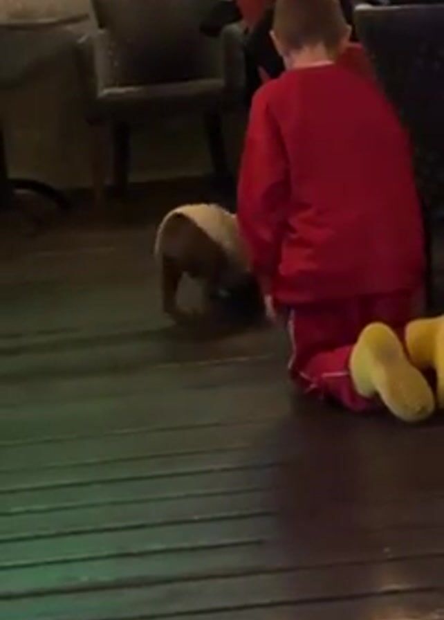 small dog and a child in an indoor setting that looks like a restaurant or cafe