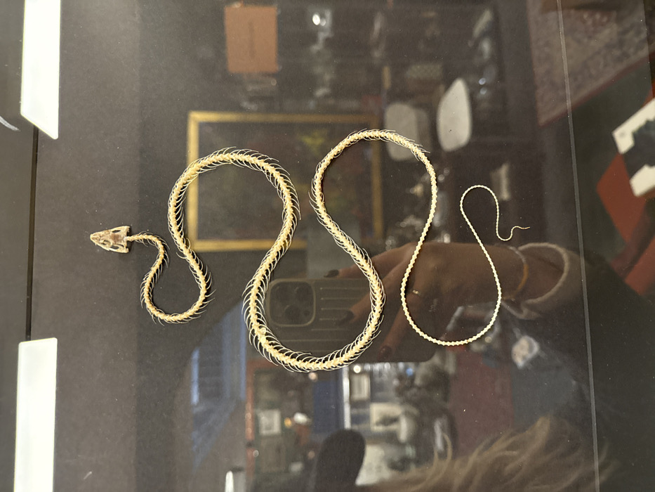 A mounted snake skeleton is displayed vertically on a dark background within a frame or display case, visible through a reflective glass front