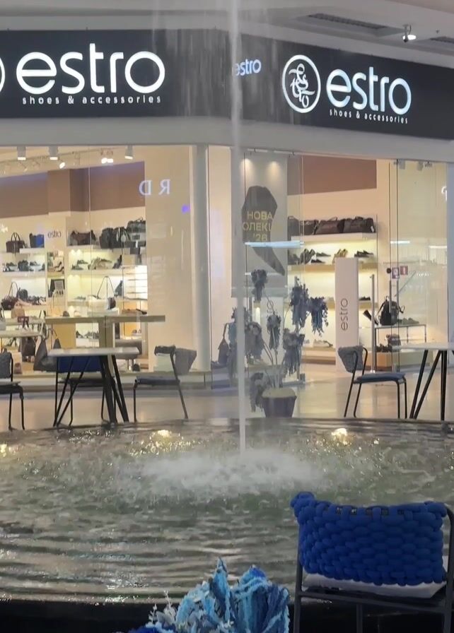 The scene is an indoor shopping mall. In the foreground is a circular fountain with water spouting upwards. A black metal chair with a blue knitted cushion and blue floral decoration is positioned in front of the fountain. Beyond the fountain is a retail store with the brand name "estro shoes & accessories" displayed above its entrance. The store's interior is visible, showcasing shelves of shoes and bags. There are tables and chairs near the storefront, seemingly for customers. The overall lighting is bright, suggesting a well-lit environment within the mall.