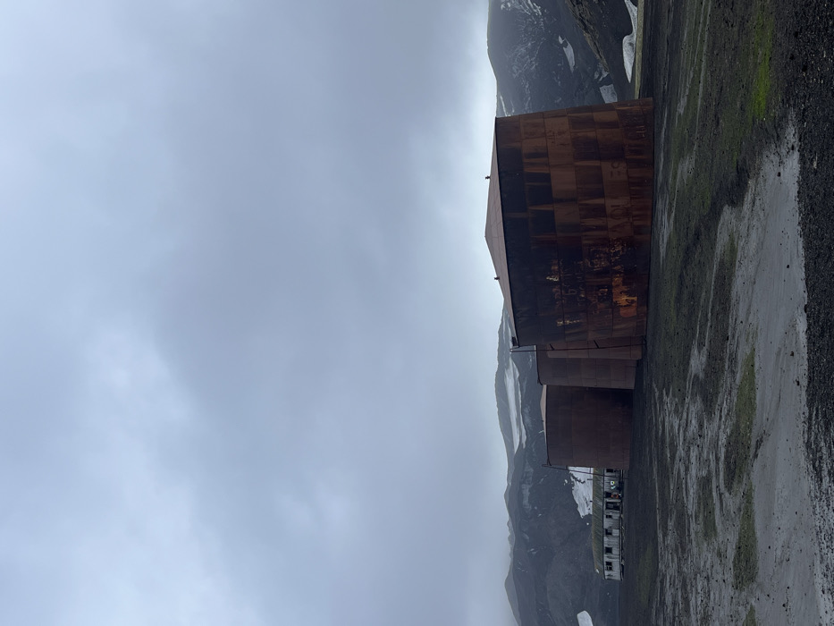 A cluster of weathered, rust-colored buildings stands against a stark, mountainous backdrop. The structures appear cuboid and cylindrical, displaying a patchwork of metal panels. Patches of snow cling to the rugged mountains. Below, the ground is wet, with puddles reflecting the overcast sky. The scene suggests a remote, industrial setting under gloomy weather conditions.