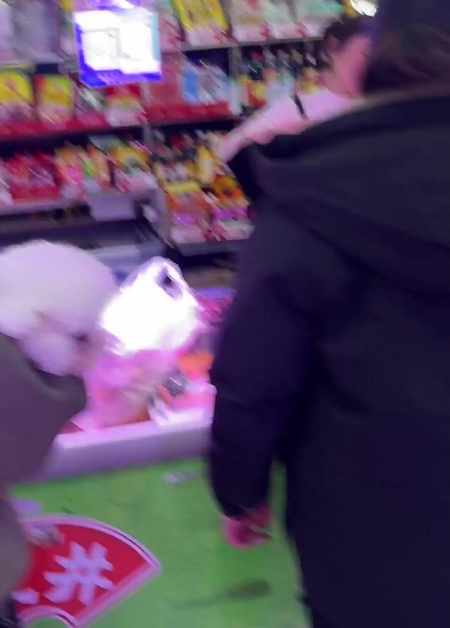 Here is a concise description of the video. The video shows a brightly lit indoor market, possibly a grocery or specialty food store in China. There are numerous shelves stocked with food items. In the foreground, several customers are visible. Two women are carrying small, fluffy dogs, one white and one gray poodle, as they appear to make purchases. A cashier wearing an apron is serving customers at a counter filled with refrigerated items.