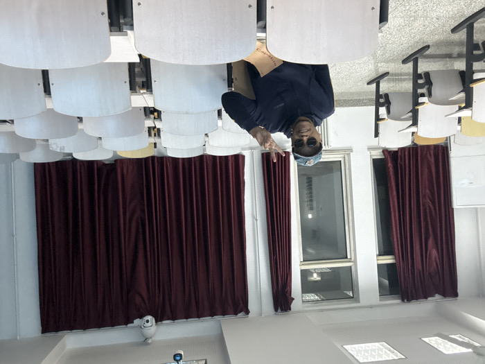 The scene depicts a male individual seated in a classroom or lecture hall, located in Daxing District, China. The man, with a dark complexion, is positioned centrally in the foreground, wearing a dark blue hooded sweatshirt, dark round sunglasses, and a light-colored baseball cap with a dark pattern. He is smiling and holds his right hand up, forming a "peace" (V) sign with his index and middle fingers. A light brown paper document or folder is visible on the desk directly in front of him. The classroom features multiple rows of unoccupied desks and chairs with light-colored, possibly wooden, seat backs and tabletops, and white metal frames. Some chairs exhibit light yellow accents. The room is brightly lit by square, recessed ceiling lights. Along the back wall, two vertical windows are visible on the left, flanked and partially covered by floor-length dark red curtains. Another section of the same dark red curtains spans a significant portion of the back wall towards the right. A white security camera with a dome casing is mounted on the ceiling, near the top right corner of the image, facing towards the front of the room. A white board or screen is partially visible on the far left wall. A white radiator is present beneath the leftmost window. The floor is light-colored and tiled. No other individuals are present in the visible portion of the room.