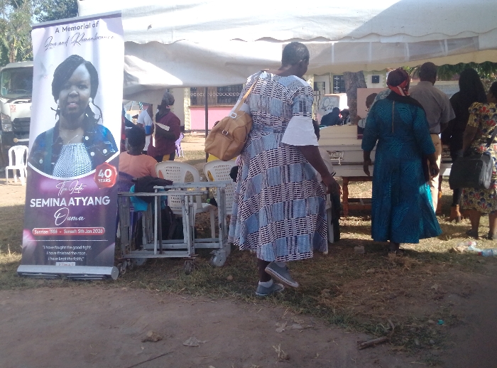 People gather near a white tent, presumably for an event. A banner displays a portrait of a woman named Semina Atyang Duma, born in 1986 and passed away on January 5, 2026, at the age of 40, signifying a memorial or funeral. The banner includes the text "A Memorial of Love and Remembrance" and a quote that reads, "I have fought the good fight. I have finished the race." One of the people has a purse hanging on their shoulder.
