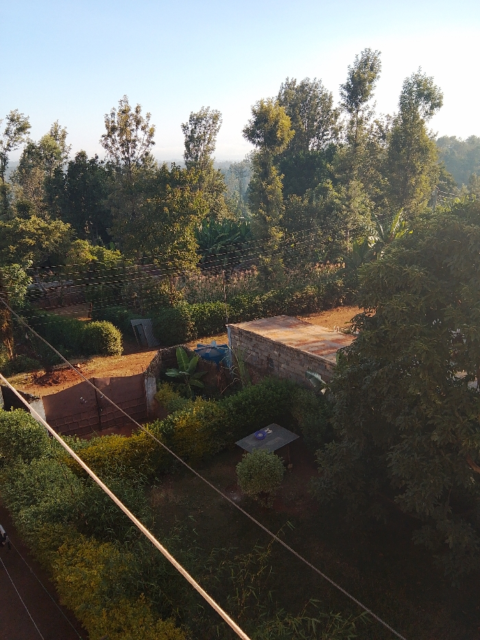 A high-angle shot captures a lush, green landscape with several trees and buildings. A clear blue sky is visible above the trees. In the foreground, there are power lines running diagonally across the view. Below, the land is covered in dense vegetation and shrubs. There are several structures, including a brick building with a rusty roof, a fenced-in area, and a small table with objects on it. The overall scene has a calm and peaceful atmosphere.