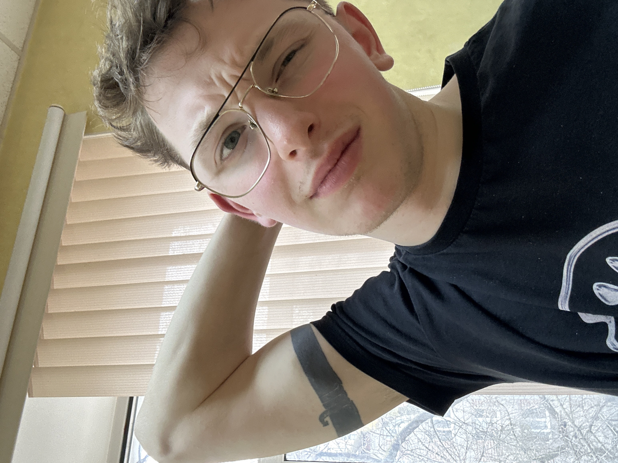 A young Caucasian male, approximately 20-30 years old, is featured in a selfie, angled slightly upwards. He has short, light brown hair, minimal facial stubble, and wears gold-rimmed aviator-style prescription glasses. His expression includes a slight pout, a furrowed brow, and his left eye (viewer's right) is partially closed in a squint or wink. He is wearing a plain black short-sleeved t-shirt. His left arm (viewer's right) is bent, with his hand positioned behind his head. A solid black band tattoo, featuring a small, lighter-colored design resembling a buckle or clasp, is visible on his upper left arm. The background shows an indoor setting with natural light source from a window on the left. Through the window, bare tree branches are visible, suggesting a dormant season. Beige vertical blinds cover the upper section of the window and extend across the middle-right background. Above the blinds, a white ceiling is visible, and to the right, a light yellow or ochre-colored wall fills the upper right portion of the frame. No specific architectural landmarks or unique identifying features are present to pinpoint a precise location within Saint Petersburg, Russia.