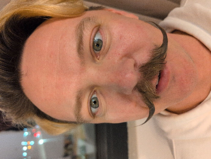 A light-skinned man with blond hair and a well-groomed, curling mustache looks directly at the camera. His eyes are green, and his expression is neutral. He is wearing a white shirt. The image is slightly blurry, and the man's face is in sharp focus. Background lights are present, suggesting an indoor setting, and are blurred with a gradient.