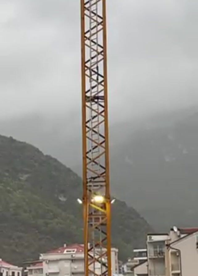 The video captures a static shot of a tall yellow construction crane, observed from a low-angle perspective