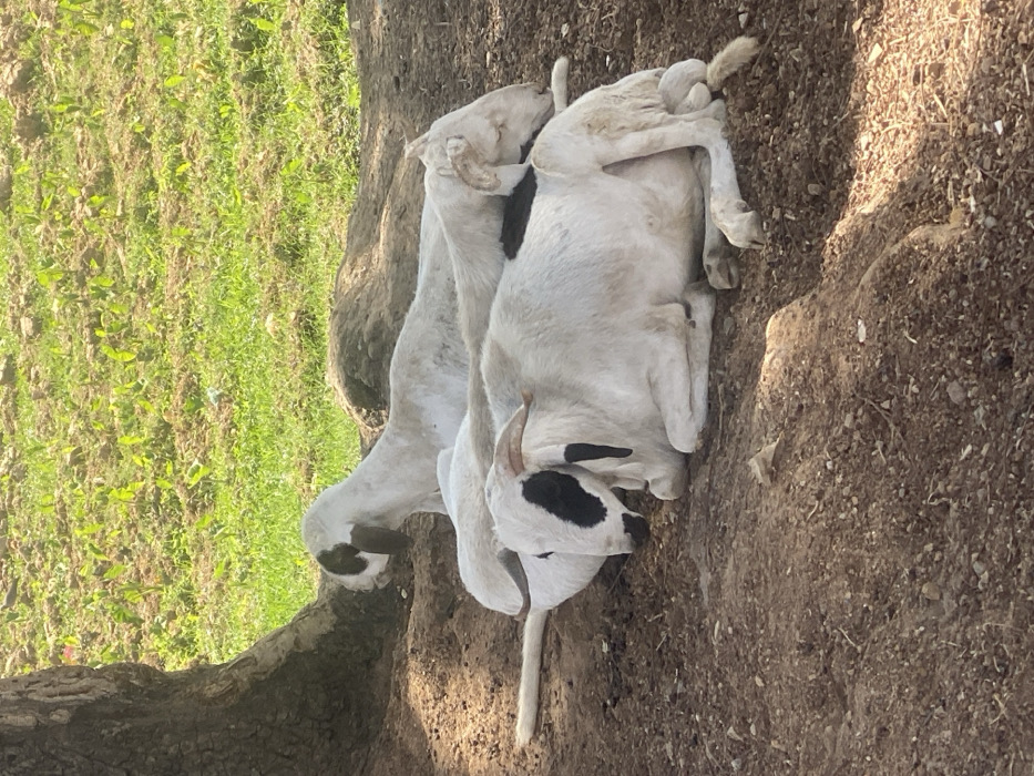 - "Three white goats are observed resting on reddish-brown, dry soil, partially shaded by the trunk of a large tree on the left" by FM-UieN92, licensed under CC BY 4.0