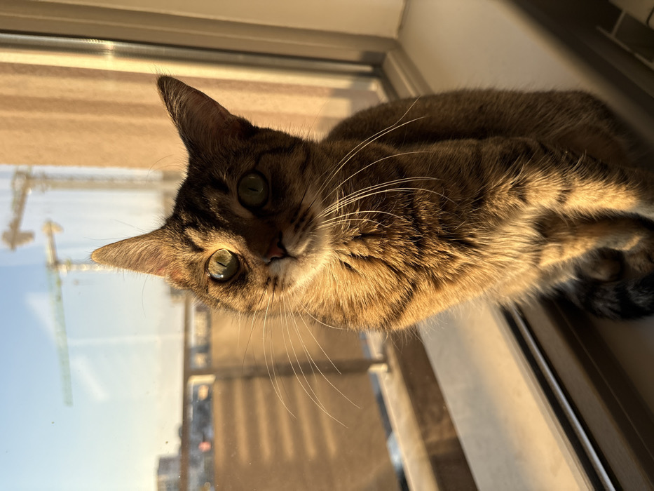 - "A domestic short-haired tabby cat, exhibiting brown, black, and tan stripes, is positioned on a light-colored interior windowsill" by FM-2Mcob2, licensed under CC BY 4.0