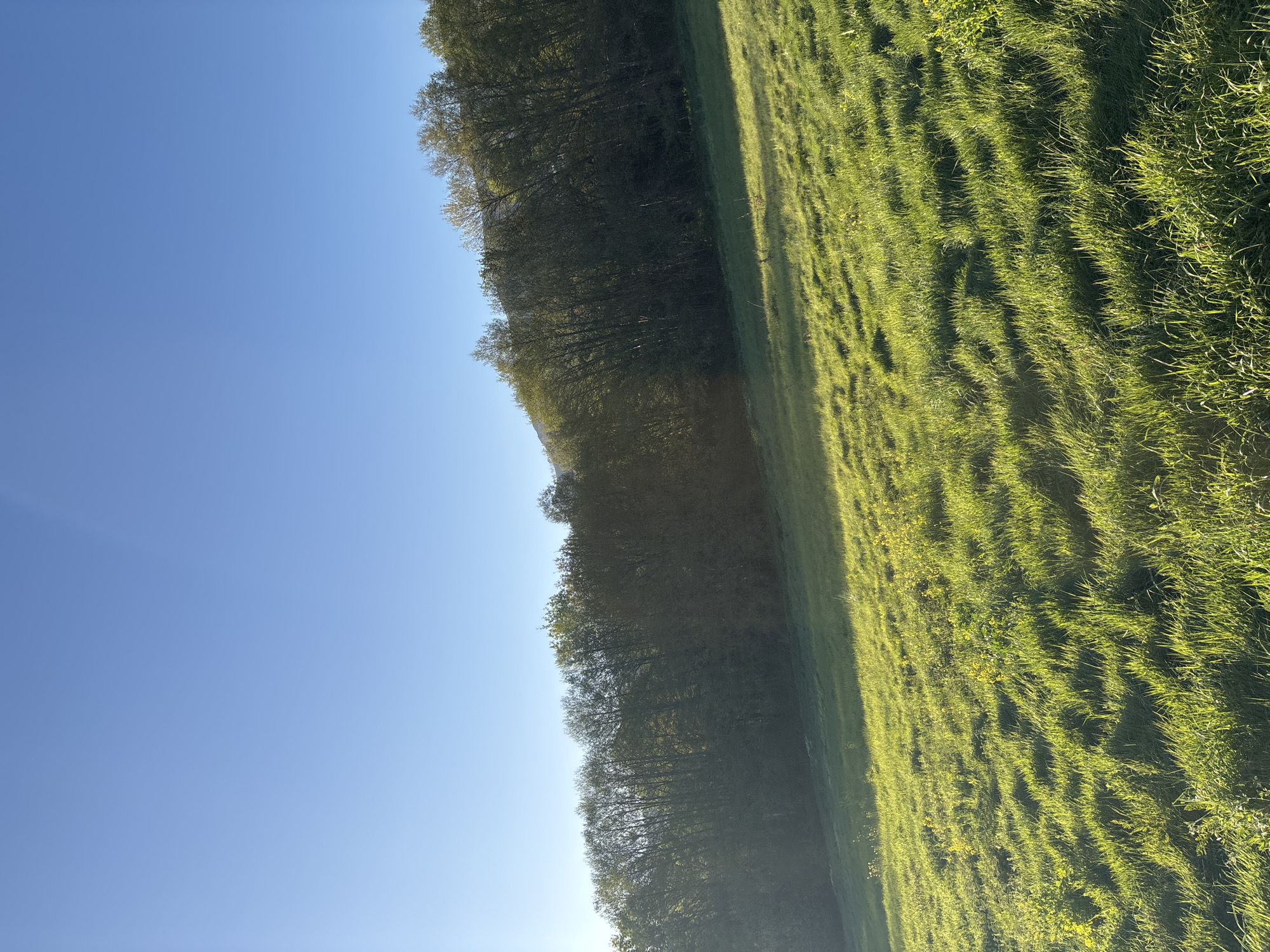 - "A landscape photograph showing a bright, clear blue sky occupying a large portion of the image, contrasting with a line of trees bordering a green field" by FM-29fHh2, licensed under CC BY 4.0