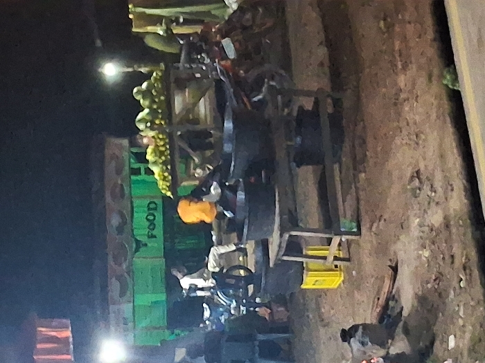 This nighttime image depicts an outdoor market or food vendor area in Takum, Nigeria, under artificial illumination