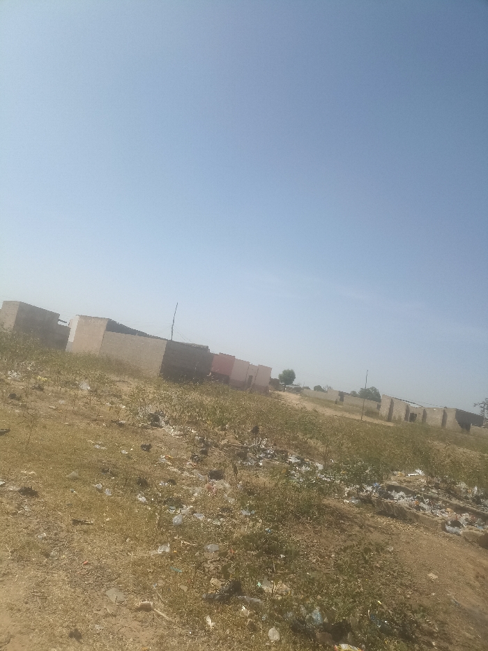 The image displays an arid, undeveloped area within Dabawa, Nigeria, under a clear, light blue sky. The foreground and midground feature dry, sandy earth interspersed with sparse, low-lying green and brown vegetation. Numerous pieces of refuse, including plastic bags and wrappers, are scattered across the ground. In the midground, a row of incomplete or basic single-story structures, constructed from light-colored concrete blocks with varying finishes including beige and pinkish hues, stretches from left to center-right. A thin, dark pole stands vertically near the center of the frame. Further in the background, more similar structures and a few distant trees are visible along the horizon line. No individuals, actions, or specific interactions are depicted.