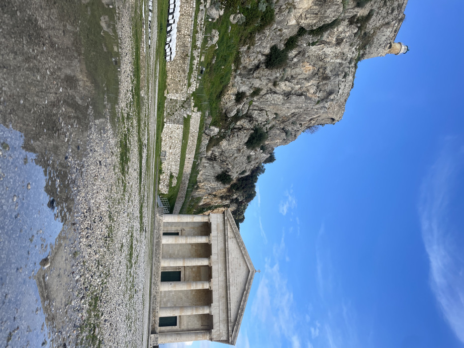 The image depicts a panoramic view within the Old Fortress (Paleo Frourio) of Corfu city, Greece. In the foreground, a gravel-covered ground interspersed with patches of green grass features multiple shallow water puddles, which reflect portions of the sky and adjacent structures. No individuals are present. To the left mid-ground, a series of low, terraced stone walls are visible, alongside a grassy area where several rows of white, possibly plastic, chairs are neatly arranged. Dominating the right mid-ground is the neoclassical Church of St. George (Agios Georgios), characterized by its prominent facade featuring six Doric columns supporting a triangular pediment, topped with a small cross. The church walls are light-colored stone, and three dark green, rectangular doors are visible beneath the portico. To the left and directly behind the church, a steep, rugged rocky cliff face of the fortress rises dramatically, covered in sparse green vegetation and exposed grey rock. At the very top of this cliff, towards the upper left, a cylindrical lighthouse with a light-colored base and a dome-shaped, light green cap is positioned. The sky above is a clear, vibrant blue with scattered wisps of white clouds. The scene is illuminated by natural daylight, casting subtle shadows.