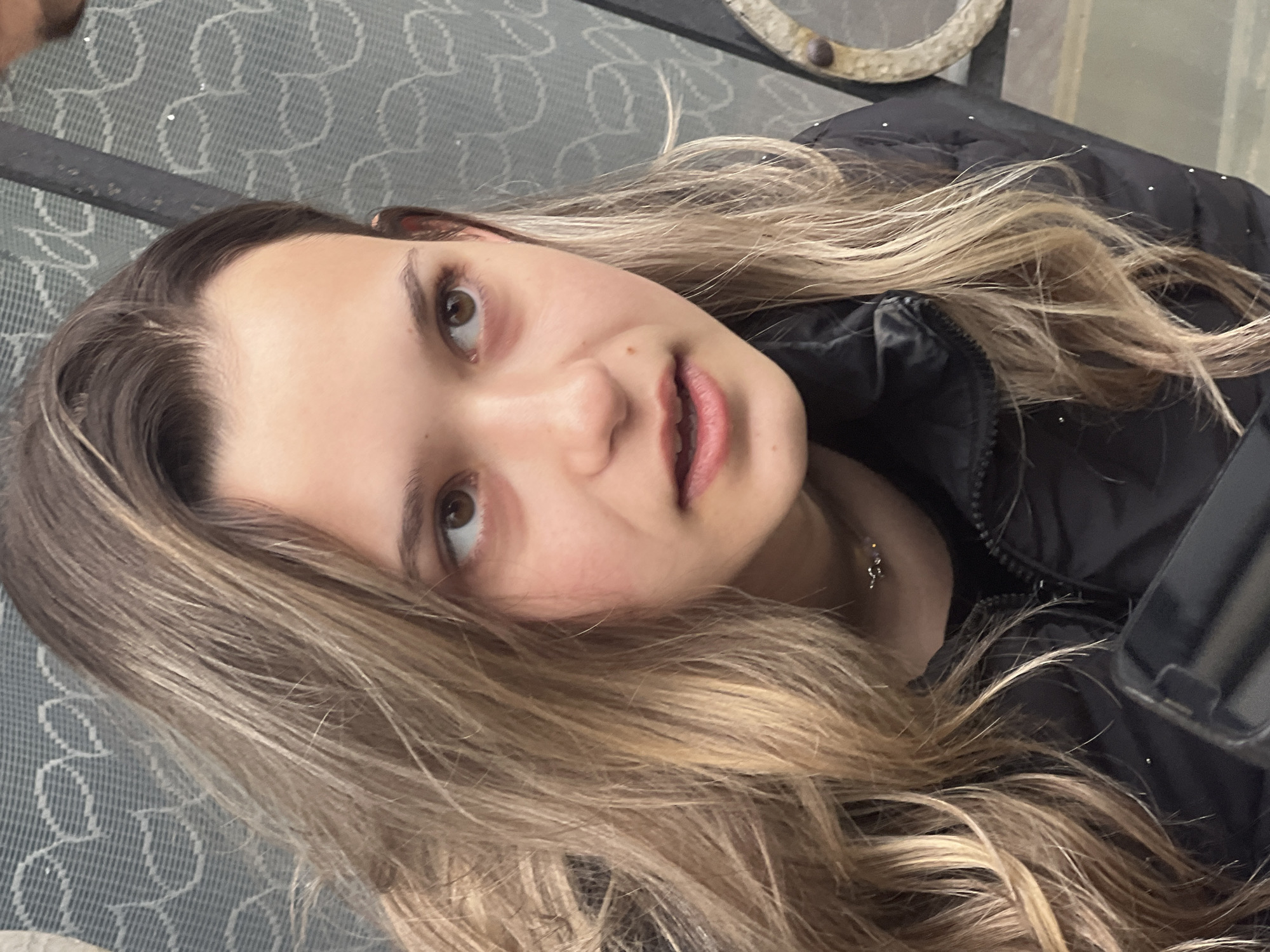 The image was captured in Cherven Bryag, Bulgaria. It features a young female, estimated to be a teenager or young adult, positioned in a close-up, chest-up portrait. She has light skin, dark brown eyes, and long, wavy brown hair with prominent blonde highlights. Her lips are slightly parted, and her gaze is directed upwards and to the right, off-camera. She wears a black puffer jacket, partially zipped, over an underlying dark garment. A small, multi-beaded necklace is visible around her neck. A dark object, possibly a phone in a case or a small bag, is partially visible in the bottom-left foreground. The background consists of a grey patterned surface with repeating oval or loop designs. To the right, a dark vertical bar is present, alongside a curved, textured, light-colored object, possibly a metal railing or decorative element.