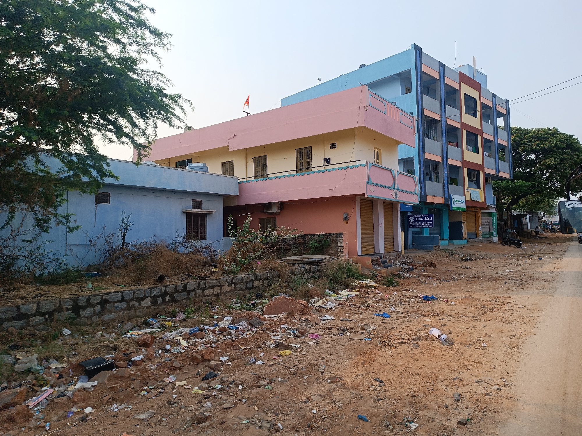 The scene is a street in Kothacheruvu, India. There are several buildings along the street, painted in various colors. One building is a light blue, while another is a combination of pink and yellow. A third building is a taller, multi-story structure with blue, gray, and brown sections. The street and adjacent areas are littered with trash and debris. Vegetation is visible near the buildings and along the street. The sky is overcast. A tree is on the left edge of the photo, partially obscuring the blue building. A street is visible on the right side of the image.