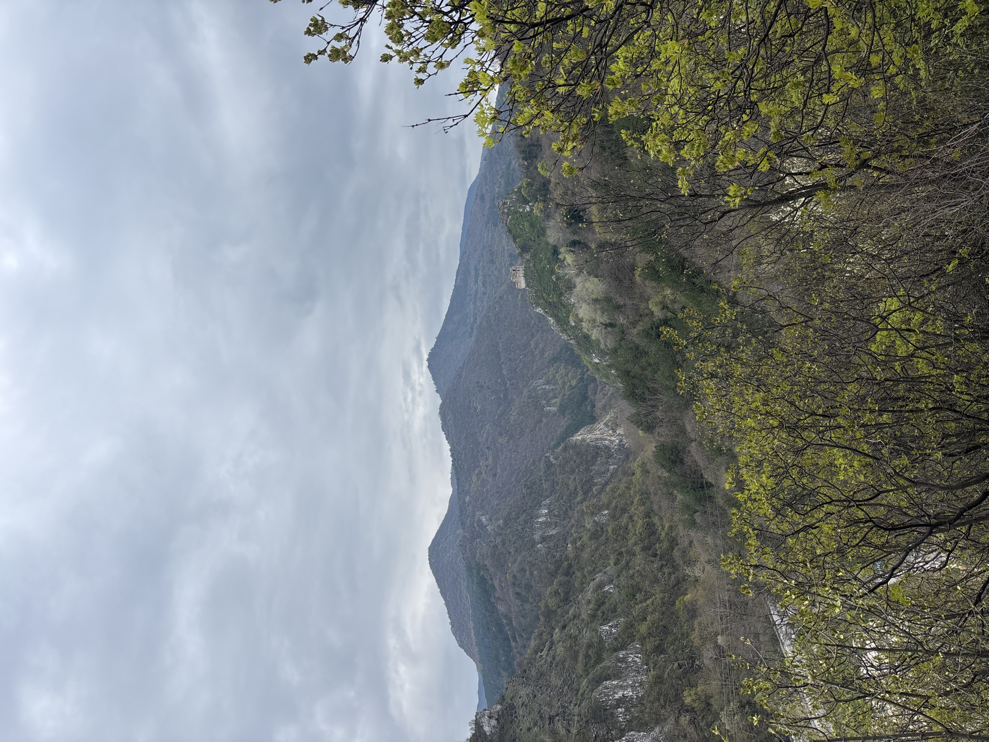 mountain landscape taken from a high vantage point near Asenovgrad, Bulgaria. The mountain is mostly covered in trees and shrubs, with some bare rock faces visible. A building is visible part way up the mountain. A thick layer of trees with young green leaves occupies the foreground on the right side of the image, and some branches with new leaves are visible at the top of the image. The sky is overcast and grey.