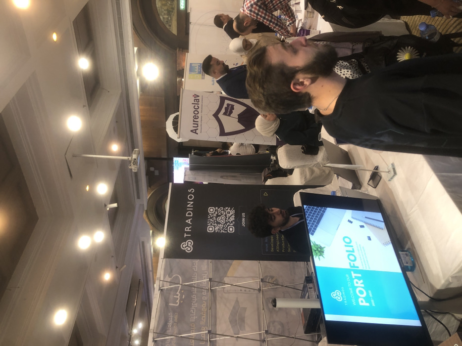 The image portrays an indoor professional exhibition or job fair situated in Al-Mazza Municipality, Syria. The venue features a white, coffered ceiling illuminated by multiple circular recessed lights, with a projector suspended centrally. In the immediate foreground on the right, a male individual with a beard and dark hair, wearing a black long-sleeved shirt and carrying a shoulder bag with a daisy motif, is captured in profile, facing towards the right side of the frame. To the left, a booth for "TRADINOS" is prominently displayed, featuring a black banner with the company's stylized logo, a QR code, and the phrase "JOIN US." Below this, text partially indicates job roles such as "Junior... Developer, AI Engineer, Production... Sales...". A young man with dark, curly hair and a beard is seated behind a white-draped table at this booth, his gaze directed downwards. On the table, a black monitor displays "WELCOME TO OUR PORTFOLIO" with the TRADINOS logo, positioned next to a laptop and a bottled water. Adjacent to the TRADINOS booth, a display for "Aureoclav" is visible, marked by a purple banner featuring the company name and a shield logo. Another banner with Arabic text stands beside it. Several individuals populate the midground; a man in a dark suit with a beard stands near the Aureoclav display, while two women wearing hijabs are observed interacting. Further right, additional attendees, including a man in a red and white plaid shirt, are gathered around other white-draped tables, which hold various objects such as laptops, water bottles, and documents. The scene depicts active professional engagement and interaction among participants.