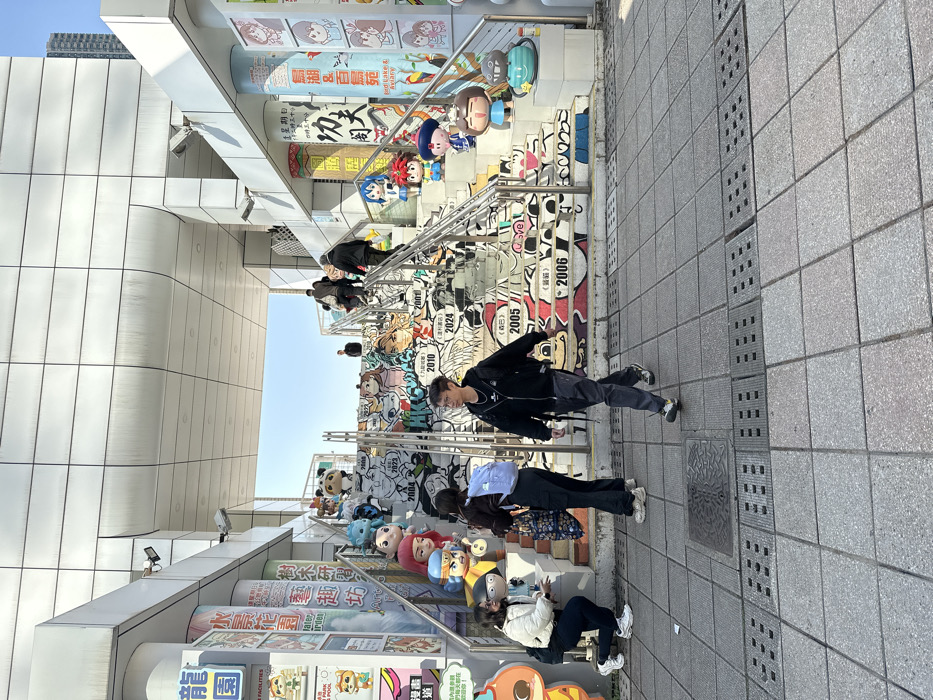 The image depicts a public space, likely in Asia, with a staircase decorated with cartoons, graffiti, and year markers. People are walking on the staircase and some are posing for pictures. There are cartoon character statues displayed along the staircase. The buildings appear modern. The stairs are adorned with cartoon-like illustrations. The area includes a tiled walkway, adding to the setting's urban feel. The OCR contains words like "comics" and "garden", implying this area may be a shopping district.