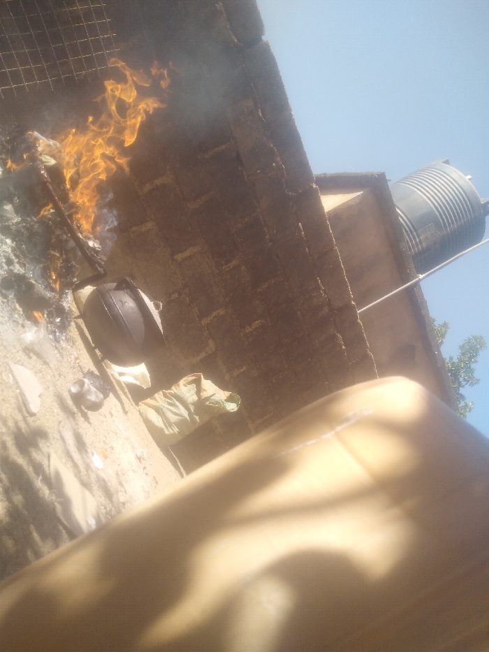 A fire blazes beneath a black pot, set against a brick wall. A water tank sits on the building's roof, visible against the bright sky. Light-colored fabric rests on the ground near the fire. The image has a tilted, low-angle perspective, with a large, blurry tan object dominating the foreground. The sky is blue in the background.