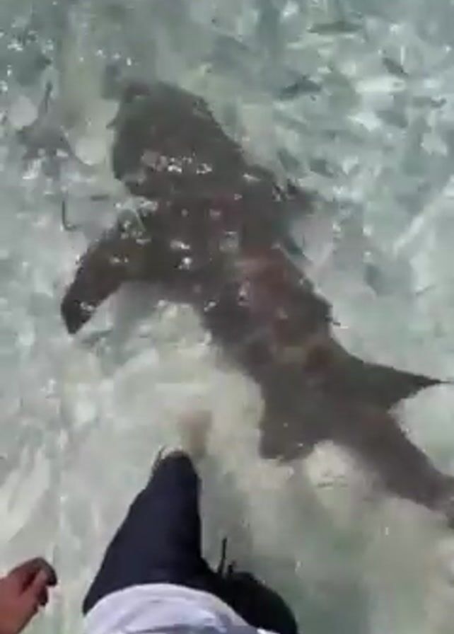 person standing in shallow, clear water with a shark swimming nearby. The person is wearing a white shirt and dark shorts and is mostly stationary. The shark is large and gray, and it swims around the person's legs. The water is clear and shallow, and the bottom is sandy. The overall environment appears to be a tropical or coastal location.