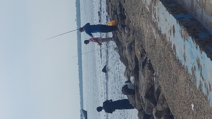 The image displays a daytime scene on the rocky coastline of Lhokseumawe, Indonesia. The sky is hazy and light gray, extending over calm, dark water where several partially submerged dark rocks are visible. A distant shoreline with green vegetation stretches across the background. In the foreground, a concrete path, partially painted blue with areas of peeling paint, adjoins a rough ground surface composed of small aggregates. Three individuals are present on a breakwater constructed from large, dark gray boulders. On the far left, an individual wearing a dark shirt and dark pants stands facing the water. Near this individual, a white plastic container and a dark cloth are on the rocks. In the middle, a second individual, dressed in a light-colored long-sleeved shirt, light pants, and a dark cap, holds a fishing rod cast into the water. The third individual, positioned on the right, wears a blue long-sleeved shirt and dark pants, also holding a fishing rod cast into the water. A yellow plastic container rests on the rocks near the third individual's feet. In the distant left background, a traditional wooden boat is visible on the water. No direct interaction is observed between the individuals; they are positioned independently, engaged in fishing or observing the water.