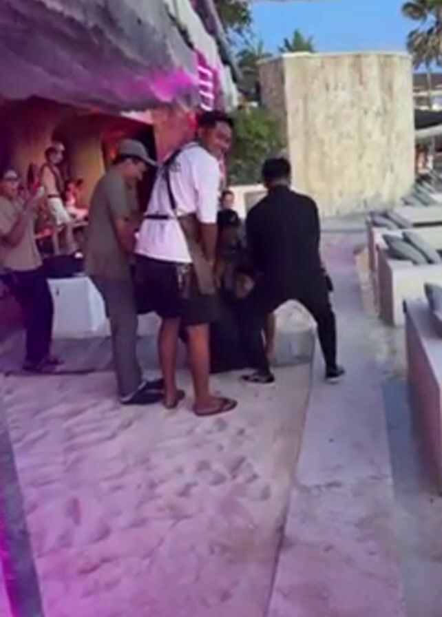 In a medium shot, several people are assisting a man who appears to be struggling to stand. The scene unfolds on what appears to be a beachside venue, with sand underfoot and a partially visible building to the left with a decorative facade and pink lighting. To the right is a raised, tiled area with lounge chairs. One man is dressed in a suit and assists by pulling the person up by their arm. A man with a strap holding something across his chest and wearing sandals and shorts is helping to hold the person up. A third man in pants, a gray shirt, and a hat is also present. The person being helped is wearing a black t-shirt.