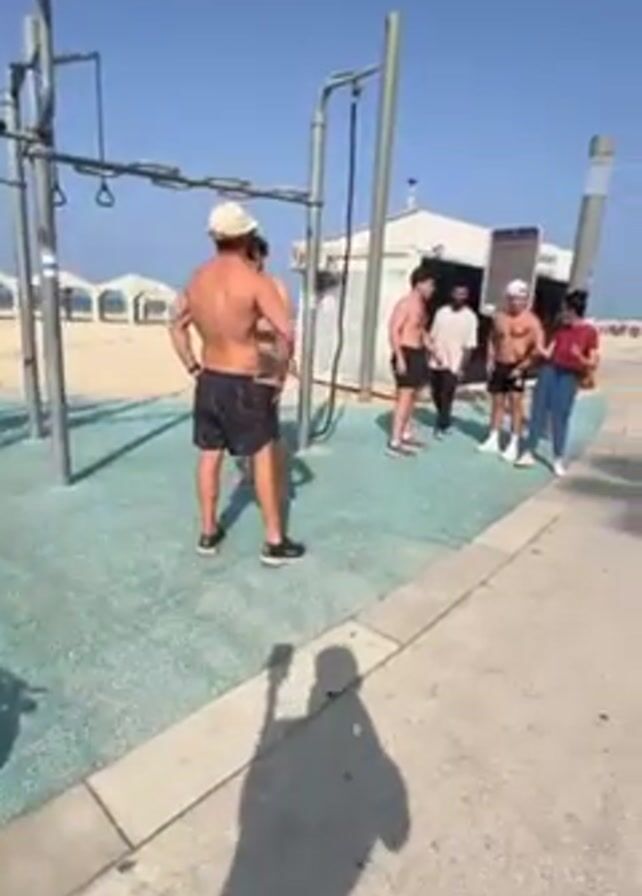 group of shirtless men exercising on a pull-up bar setup on a sunny beach. A phone is recording the scene on a tripod. One man is actively doing pull-ups on the bars, while others stand around observing. Additional people are visible walking along the paved walkway nearby. The sky is clear and blue. There are buildings and white tents in the background. A flag waves in the distance.