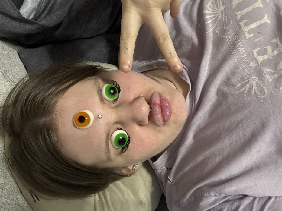 An overhead photograph captures an individual lying down in an indoor setting. The subject, with light-colored skin and short brown hair, is wearing a light purple long-sleeved t-shirt, which exhibits minor tears on the left shoulder and a partial white graphic on the lower right depicting floral elements and the word "ALWAYS". Facial features include a silver stud piercing positioned above the nose bridge and a silver hoop septum piercing. An earring is visible in the left earlobe. Three confectionery eyeballs are affixed to the face: two green eyeballs with black pupils and false eyelashes are placed over the natural eye areas, and one orange eyeball with a black pupil is centrally located on the forehead. The individual's lips are pursed. The right hand is visible, forming a peace sign gesture, and a faint tattoo is present on the inner side of the index finger. The background consists of a light-colored pillow on the left and a dark grey fabric on the right. This scene is located in Saratov, Russia.