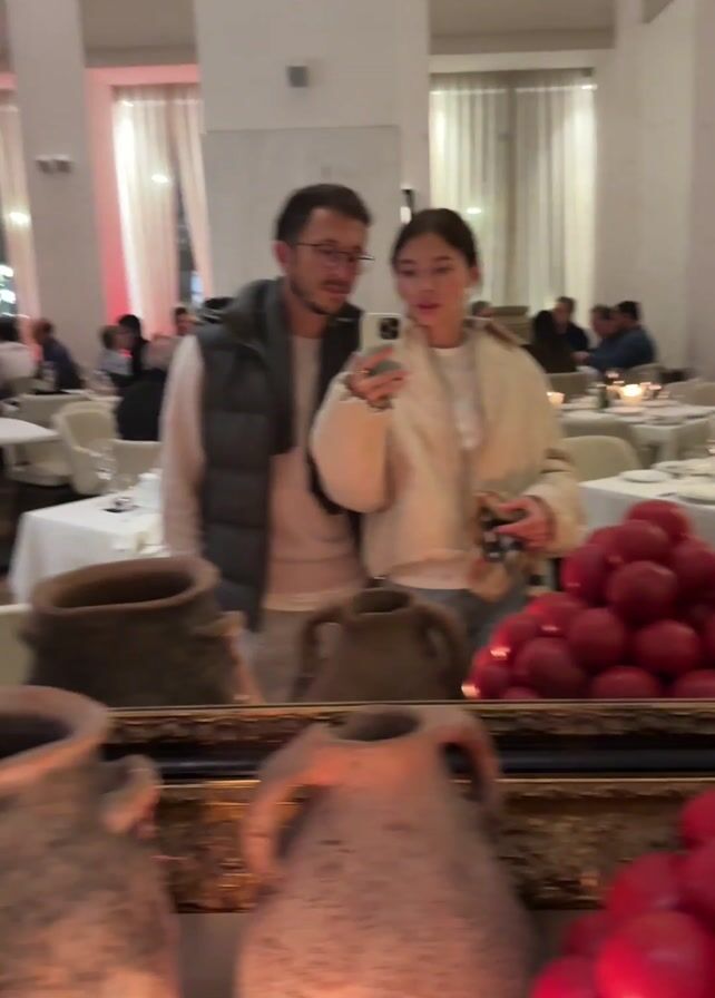 A couple is taking a selfie in a restaurant. The man is wearing glasses and a gray vest over a light-colored shirt. The woman is wearing a light-colored jacket. They are standing in front of a mirror decorated with large, weathered clay pots and a pile of glossy red spheres. Other people are seated at tables in the background, which are covered with white tablecloths. The woman kisses the man on the cheek while holding up her phone.