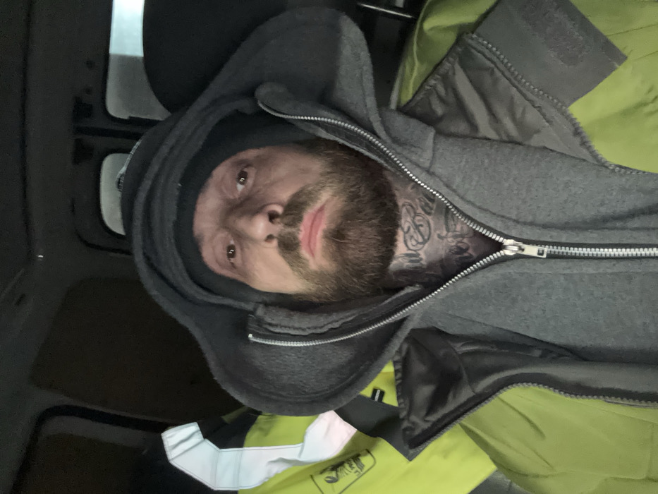 A man with a beard and a Celtic tattoo on his neck poses in a gray hooded sweatshirt, which is zipped up to his throat. He wears a black beanie under the hood. The man's face appears to be slightly dirty. Parts of a yellow and gray high-visibility vest are visible at the bottom. The background suggests he might be sitting in a vehicle, possibly a van, with dark windows and a black headrest behind him. The image appears to be taken at an unusual angle, possibly from below.