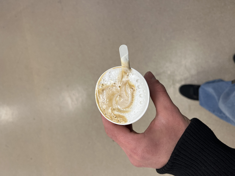 A top-down view shows a person's light-skinned right hand, clad in a black ribbed sleeve, holding a white disposable coffee cup. The cup contains a beverage with light brown liquid and white frothed milk, featuring a swirled pattern resembling rudimentary latte art. A white, flat plastic stir stick is partially submerged in the beverage, extending from the right side of the cup. Below the hand, blue denim jeans are visible, along with a dark-colored shoe on the person's right foot. The immediate environment is a uniform, light beige or light grey floor, appearing smooth and hard. This scene is attributed to an indoor location within the city of Erstein, France.